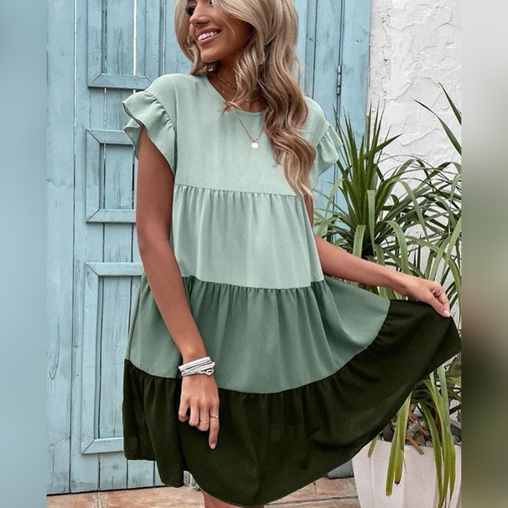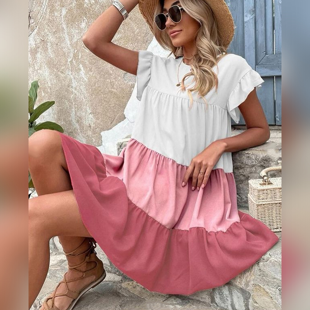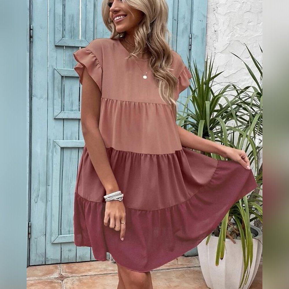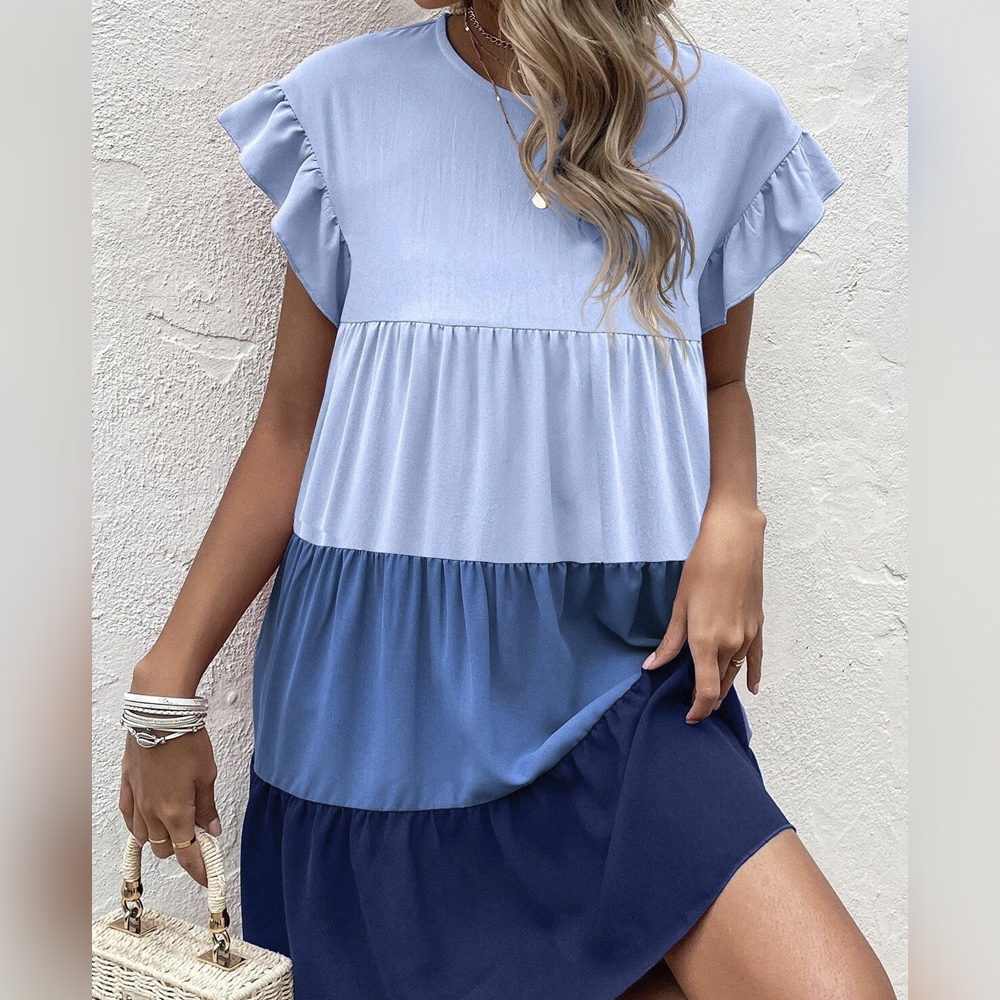 Block Flounce Sleeve Ruffle Hem Chiffon Smock Dress