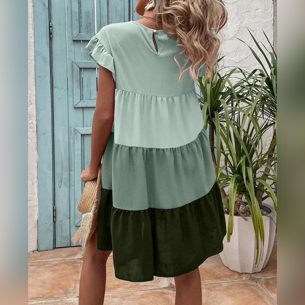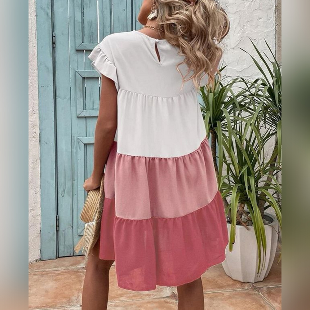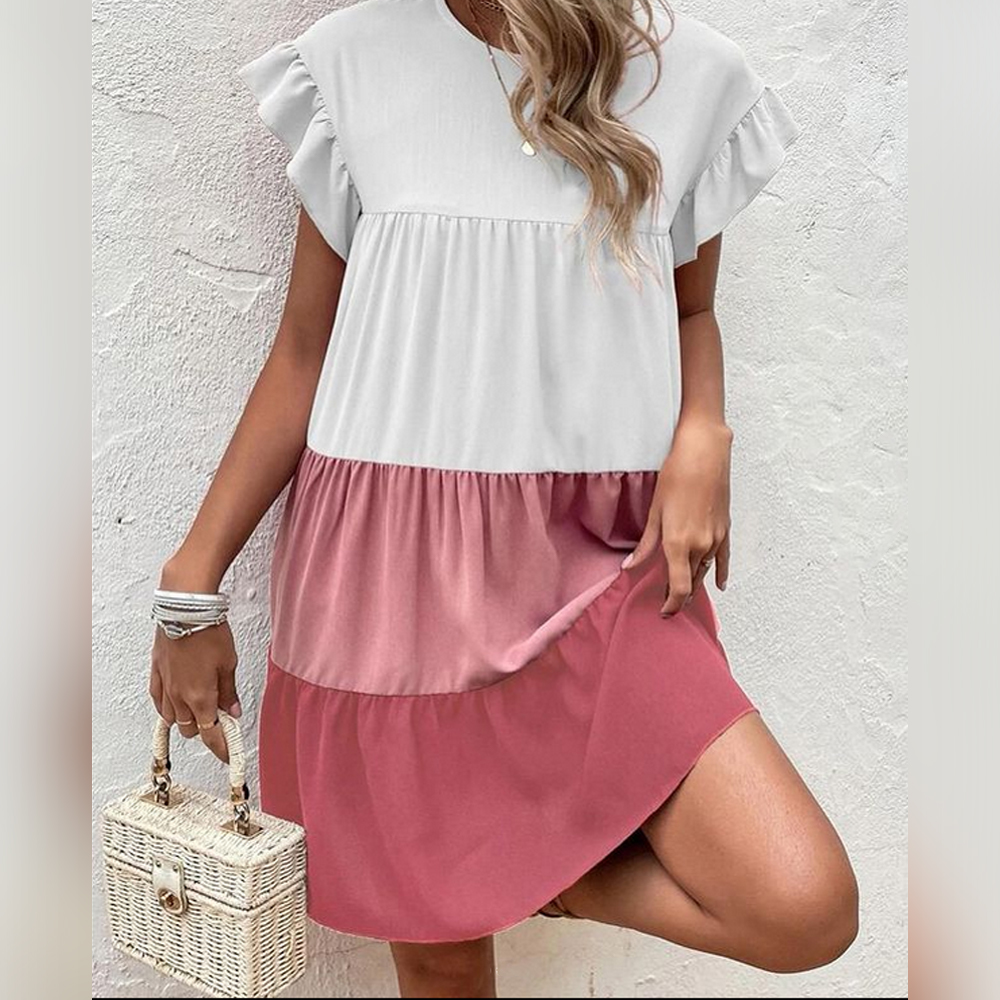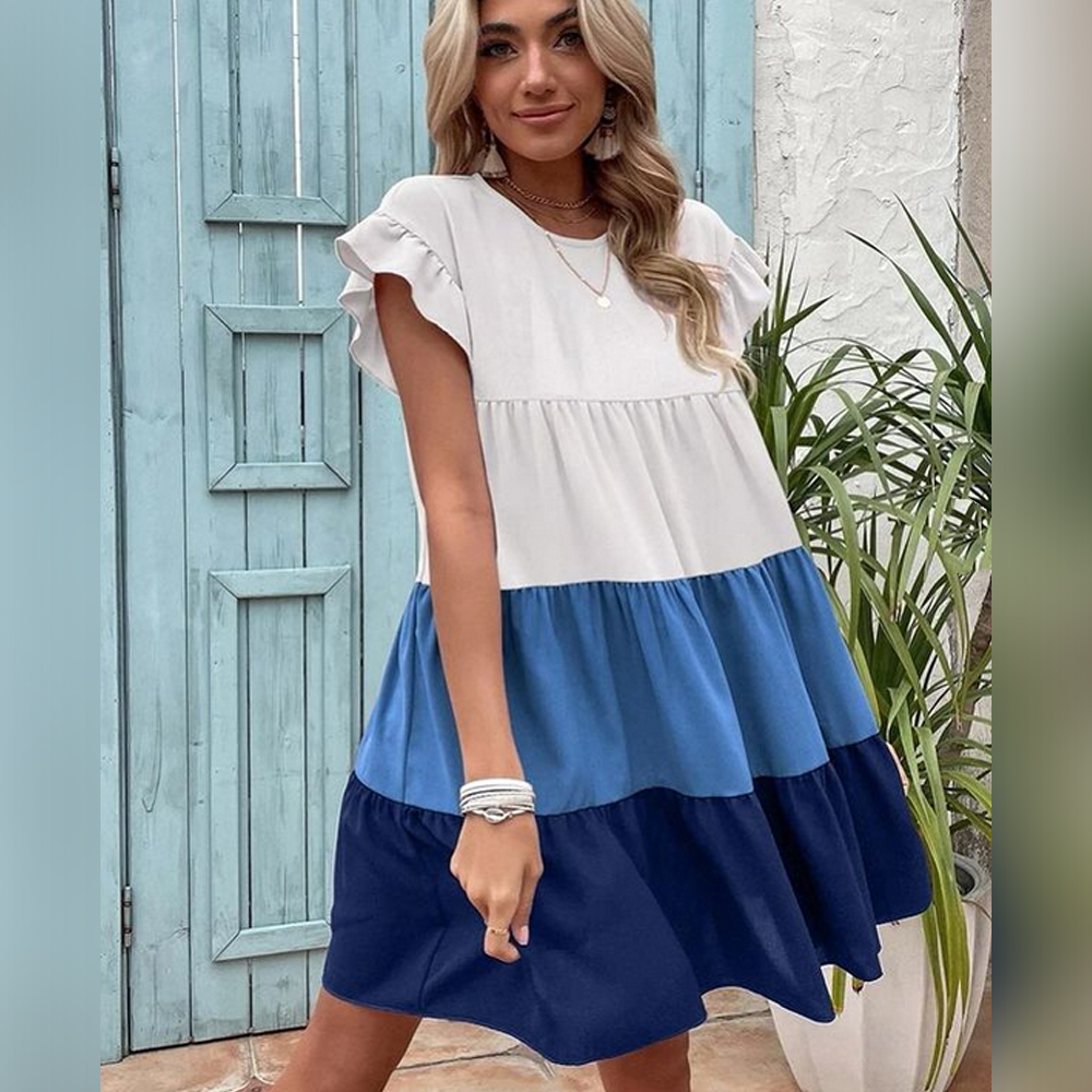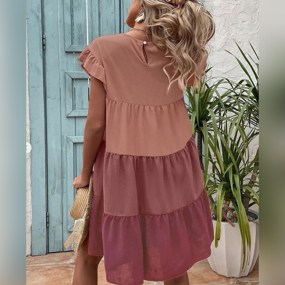 Block Flounce Sleeve Ruffle Hem Chiffon Smock Dress